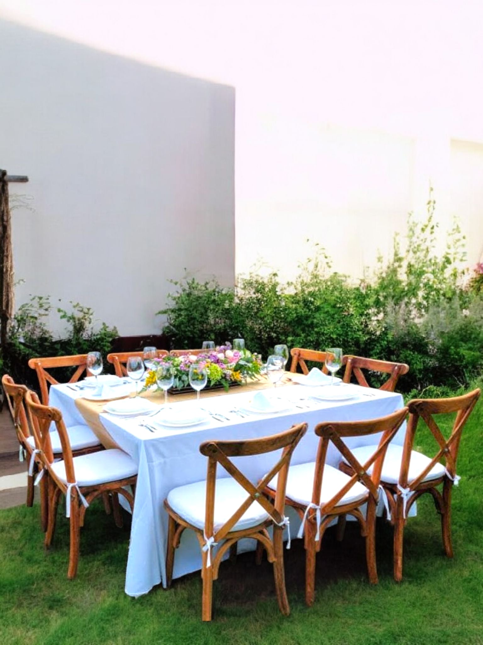 - 10 sillas de madera crossback con cojín.